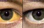 - Пожелтение склер различной степени, в редких случаях – проявление желтого оттенка на коже